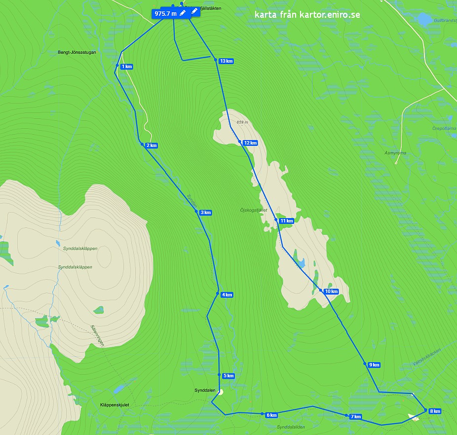 Nu fortsätter vi till leden som vi ser till höger mot stolpe 1316. Den följer vi nu till vänster, över broarna och de tre kilometrarna bort till Källfjället och raststugan. Se beskrivning under