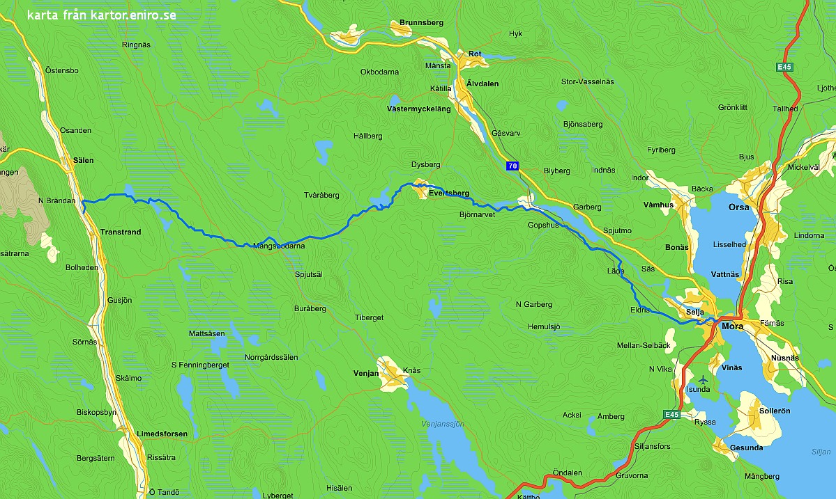 Leden fortsätter därefter längs vägen cirka två kilometrar. Vinterspåret sticker av norrut efter halva sträckan. Trots att vi går längs vägen så är det en mycket vacker sträcka med sjöar på båda sidor. På höger hand ser vi en lockande badplats dit vi kommer efter en stund. Här finns rastplats och omklädningsrum, bryggor och hopptorn. Stigen fortsätter nu uppför genom skogen på en lättgången grusväg nästan hela vägen fram till Evertsberg. På ett ställe genar stigen längs kanten av en äng innan vi korsar vägen. De sista trehundra meterna går längs grusväg och så viker vi in vid Vasaloppskontrollen och går under portalen. Nu är halva sträckan gjord!